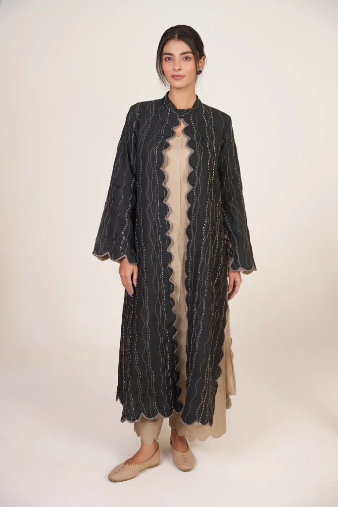* Long Linen coat featuring contrast sultani stitching and kanni gudri, intricate scalloped embroidery along the front opening, hem, slits, and cuffs. * Style it with our rose kurta set. * Estimated ship time: 5 - 7 working days. * The garment color may vary slightly due to photographic lighting or the screen settings of your device. * Please check the measurement chart and return policy before placing the order. * Model is wearing size ’s’