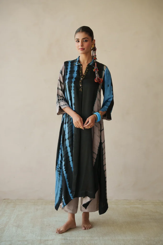 * Asymmetrical tie-and-dye kurta in rich festive tones
