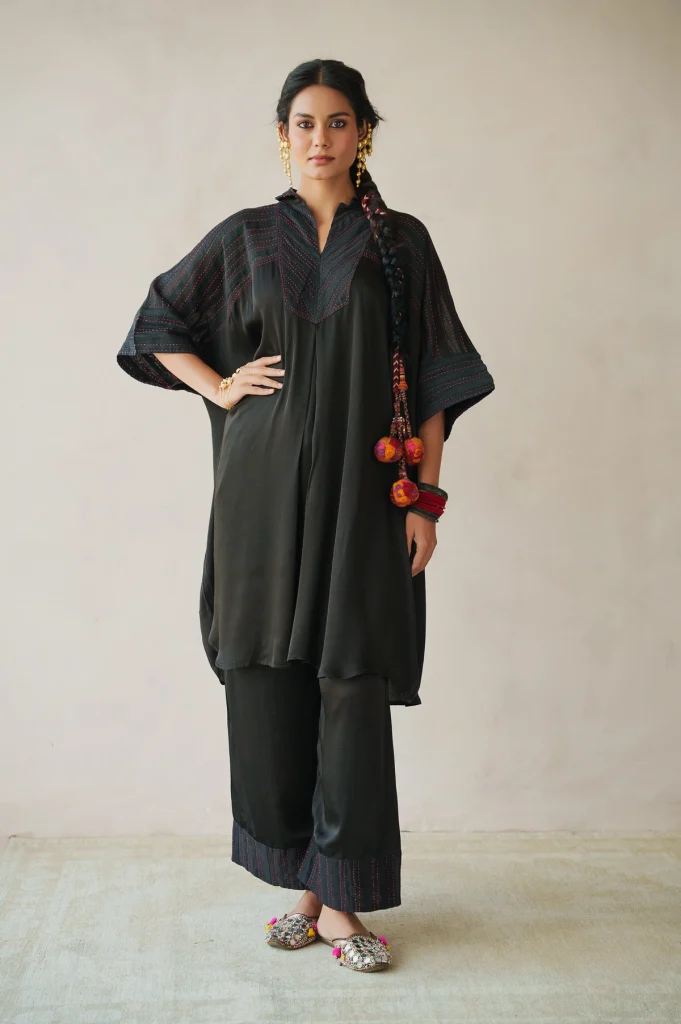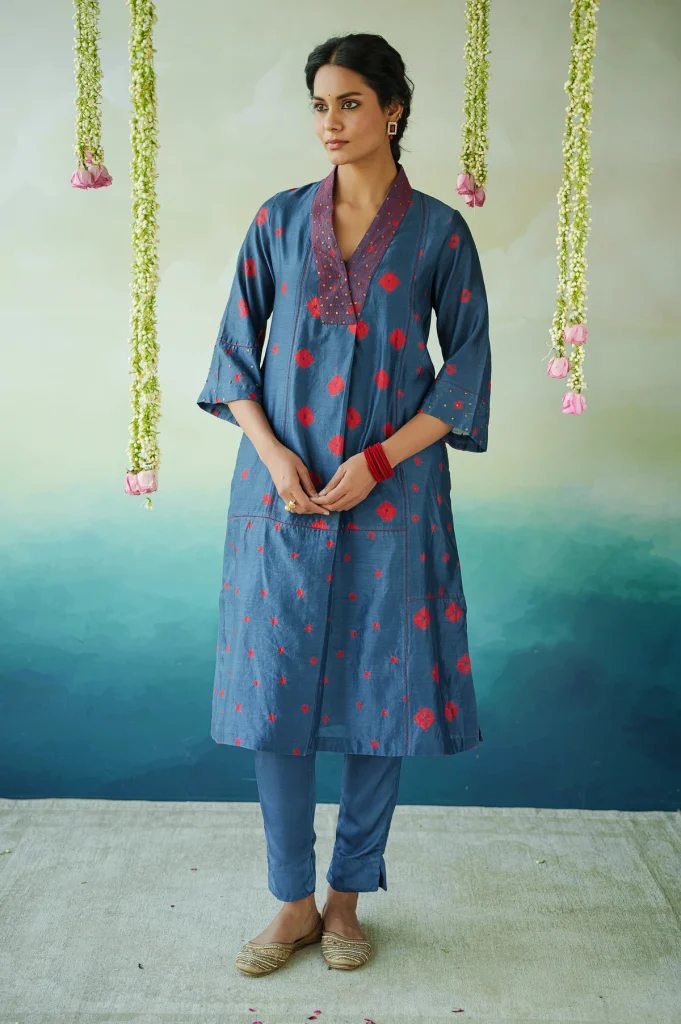 * Pure silk kurta with all-over random indigo sultani stitch embroidery