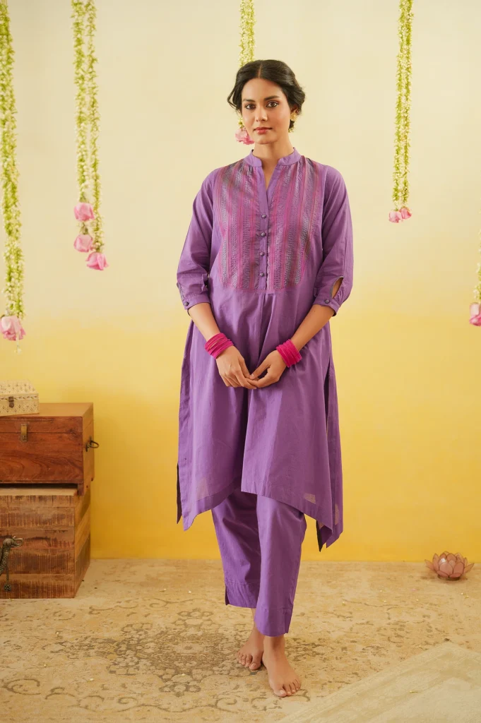 * Cotton Mulmul Purple asymmetrical kurta with silk yoke highlighted with Jali stitch and gudri work.