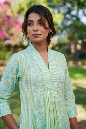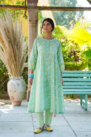 ₹5,200.00* Cotton mulmul handblock printed kurta with solid colour pants. * Sultani stitchwork on neckline, light gather detail underneath the neckline. * Finished with French seam. * Estimated ship time: 5 - 7 working days. * The garment color may vary slightly due to photographic lighting or the screen settings of your device. * Please check the measurement chart and return policy before placing the order. * Model is wearing size ’xs’