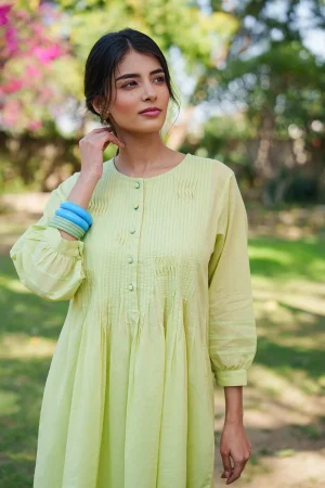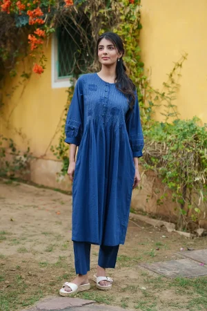 ₹5,000.00* Cotton mul kurta with pants * Pintuck detailing in front, back and sleeves of kurta * Finished with French seam. * Estimated ship time: 5 - 7 working days. * The garment color may vary slightly due to photographic lighting or the screen settings of your device. * Please check the measurement chart and return policy before placing the order. * Model is wearing size ’xs’.