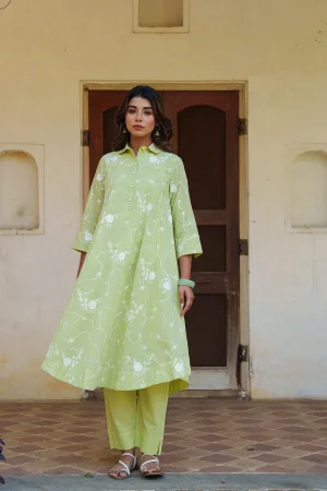 ₹5,300.00* Embroidered Cotton Kurta with Pants. *Collared kurta with front button placket with potli buttons * Finished with French seam. * Estimated ship time: 5 - 7 working days. * The garment color may vary slightly due to photographic lighting or the screen settings of your device. * Please check the measurement chart and return policy before placing the order. * Model is wearing size ’xs’.