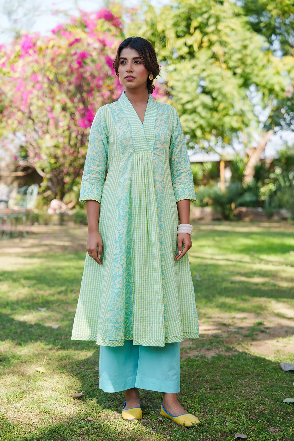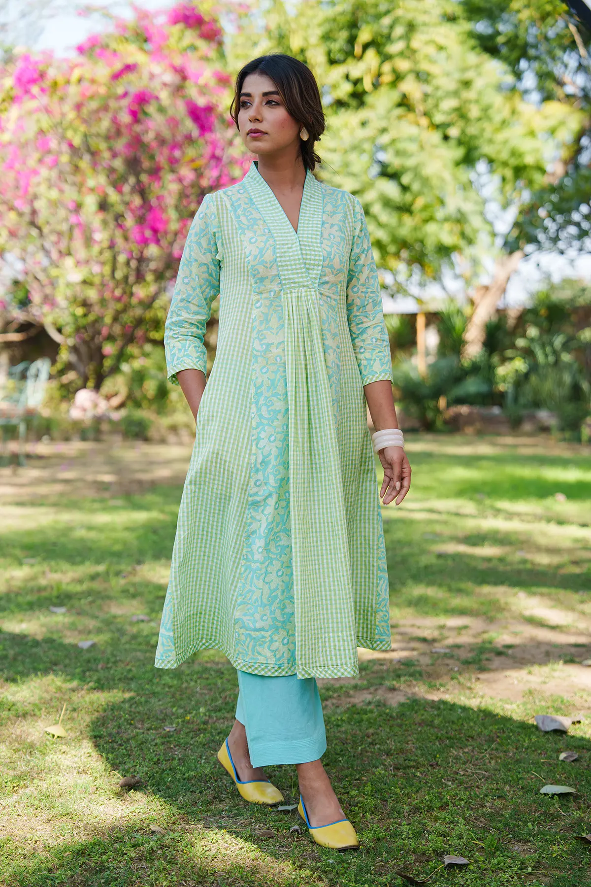 * Cotton mulmul handblock printed kurta with solid colour pants.