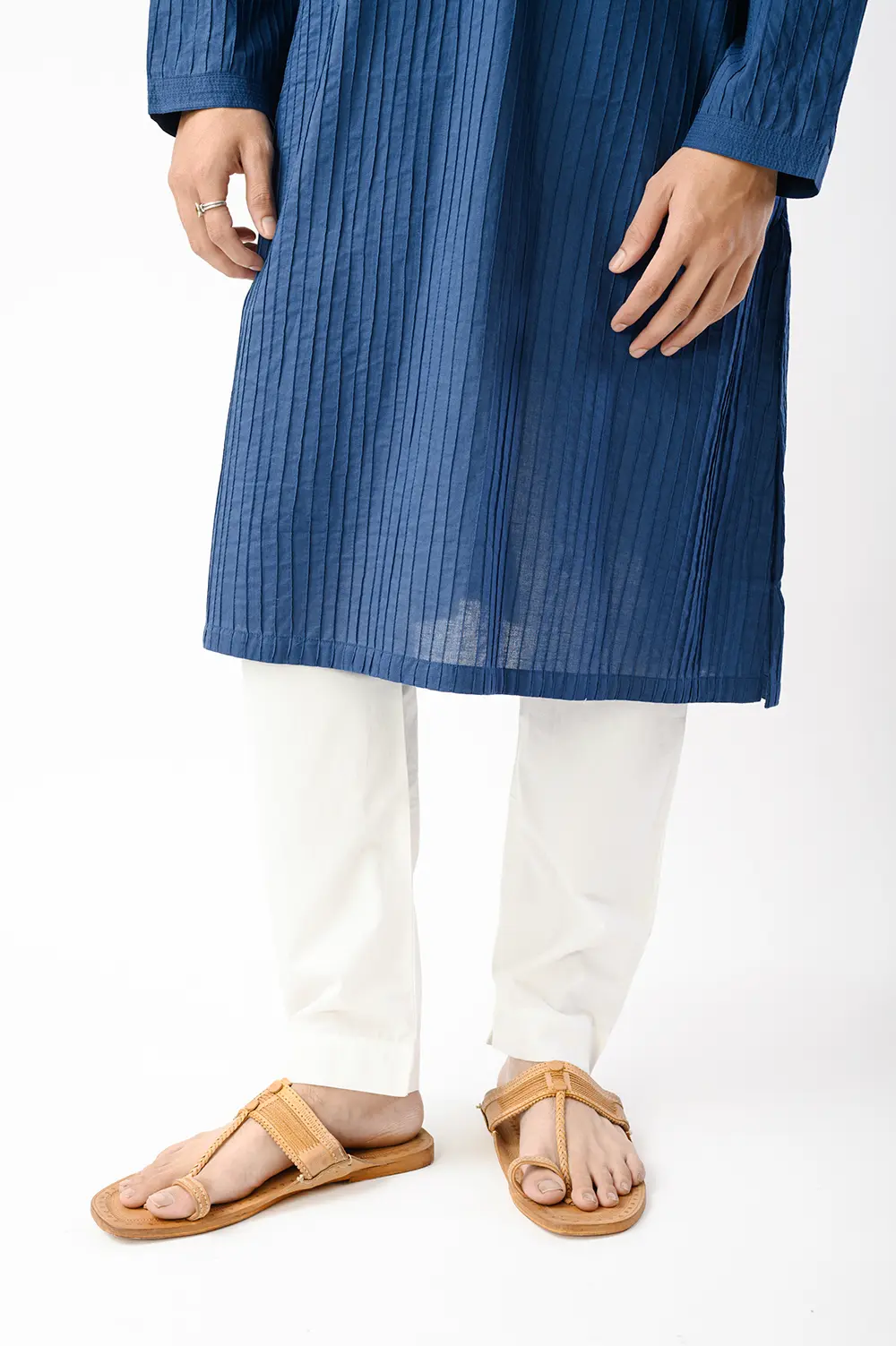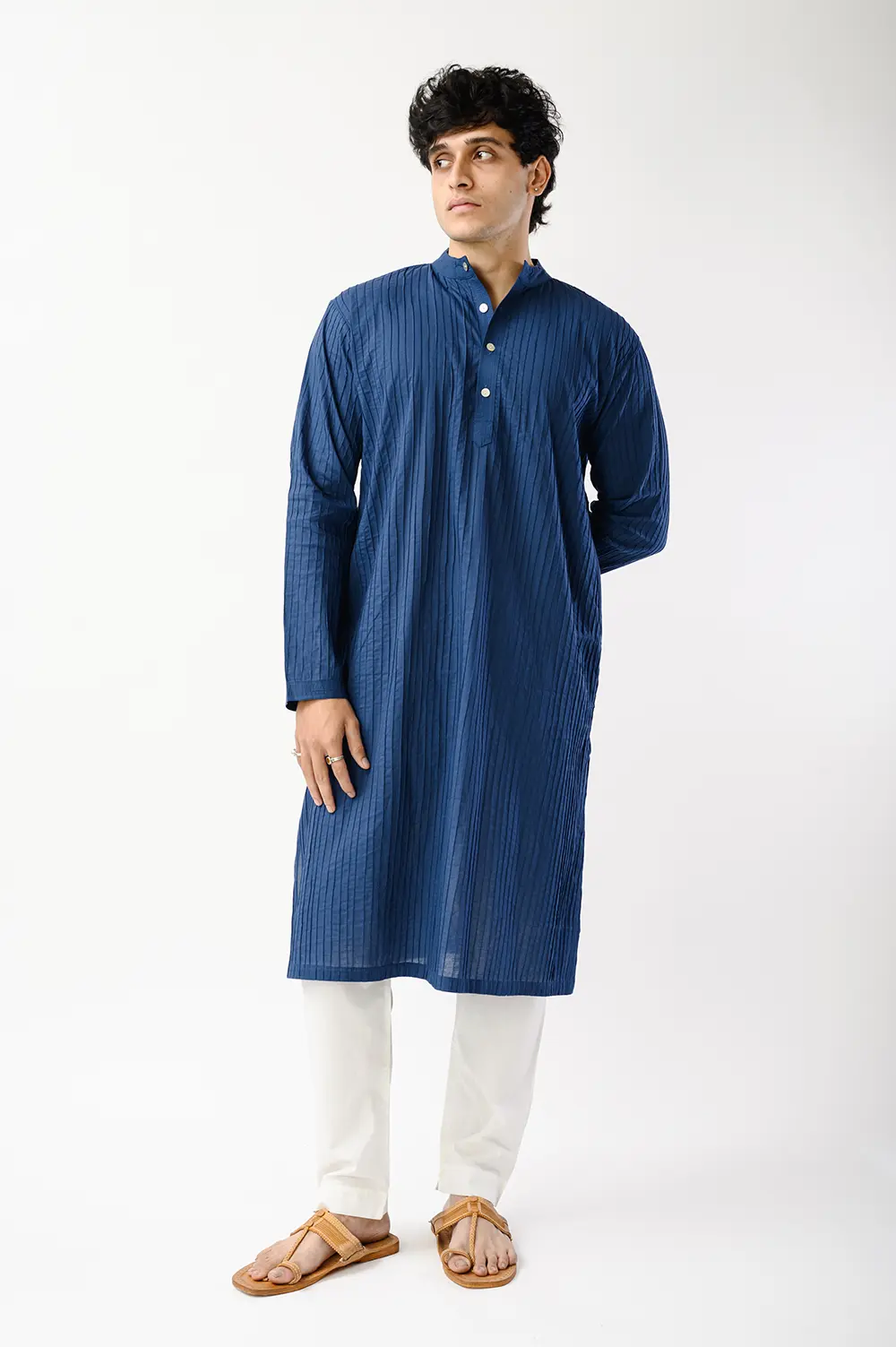 The Men’s Pintuck Kurta is made from soft, breathable cotton mulmul, offering a lightweight and airy feel. Its subtle pintuck detailing adds an elegant touch, making it perfect for both casual and festive occasions.