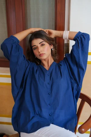 ₹2,200.00* Cotton Mul V-Neck Indigo Top * Gathers on shoulders and below back yoke. * Contrast gudri on shoulders, back and sleeves, front placket with potli buttons. * Finished with French seam. * Estimated ship time: 5 - 7 working days. * The garment color may vary slightly due to photographic lighting or the screen settings of your device. * Please check the measurement chart and return policy before placing the order. * Model is wearing size ’xs’.