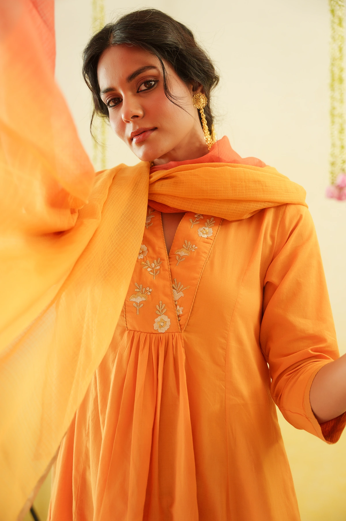 Lightweight and elegant, this Kota Doriya Dupatta is designed to elevate your festive look. Featuring a soft shaded effect with delicate gold print highlights, it brings just the right amount of shimmer for special occasions. The hem is finished with applique detailing, adding a handcrafted touch of refinement. Perfectly paired with our Marcia Kurta Set, this dupatta completes your outfit with festive grace and timeless charm.