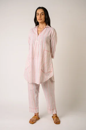 ₹4,600.00| * Cotton mulmul handblockprinted co-ord set. * Collared kurta in stripes with a coordinated ikat pants. * Finished with French seam. * Estimated ship time: 5 - 7 working days. * The garment color may vary slightly due to photographic lighting or the screen settings of your device. * Please check the measurement chart and return policy before placing the order. * Model is wearing size ’xs’ |