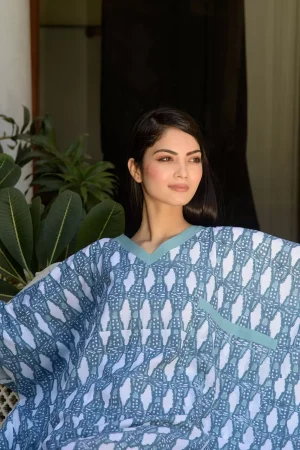 This product is hand block printed and there might be slight irregularities in colour and prints occurring. These irregularities are the hallmark of hand block printed product and make each exquisite piece one-of-its-kind. This hand block printed long cotton voile Kaftan is stitched in very fine cotton voile fabric. It feels soft to touch and light in weight.