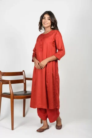 Modal Satin Embroidered Round Sleeve Kalidar Kurta – Red