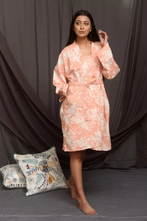 This product is hand block printed and there might be slight irregularities in colour and prints occurring. These irregularities are the hallmark of hand block printed product and make each exquisite piece one-of-its-kind. This Peach hand block printed long cotton voile kimono & slip with gudri work loungewear is a two piece set ,stitched in very fine cotton voile fabric. The set combines a long kimono with slip set. The printed comfy long kimono set is detailed with Kantha work and stitched finely for utmost comfort.