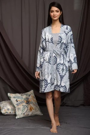 This product is hand block printed and there might be slight irregularities in colour and prints occurring. These irregularities are the hallmark of hand block printed product and make each exquisite piece one-of-its-kind. This Grey hand block printed short cotton voile kimono & slip with gudri work loungewear is a two piece set ,stitched in very fine cotton voile fabric. The set combines a long kimono with slip set. The printed comfy short kimono set is detailed with Kantha work and stitched finely for utmost comfort.