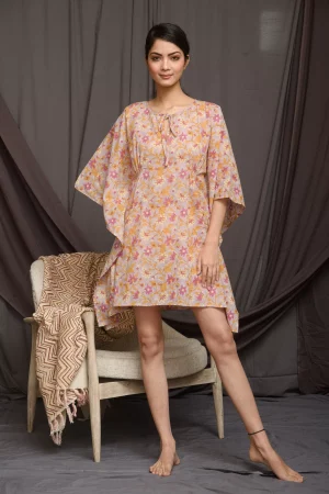 This product is hand block printed and there might be slight irregularities in colour and prints occurring. These irregularities are the hallmark of hand block printed product and make each exquisite piece one-of-its-kind. This hand block printed short cotton voile Kaftan is stitched in very fine cotton voile fabric. It feels soft to touch and light in weight.