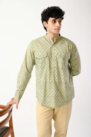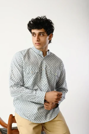 ₹1,800.00* Handblock printed full sleeves shirt with Mandarin collar. * Buttoned up shirt with 2 pockets on chest. * Estimated ship time: 5 - 7 working days. * The garment color may vary slightly due to photographic lighting or the screen settings of your device. * Please check the measurement chart and return policy before placing the order. * Model is wearing size ’S’