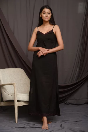 This Black plain dyed long slip loungewear is stitched in very fine cotton voile fabric. The Long slip loungewear is detailed with Kantha work and stitched finely for utmost comfort. It feels soft to touch and light in weight.