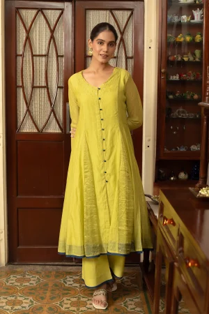 Our stunning Fish Kali Kurta with Pants, crafted from luxurious Chanderi fabric and adorned with exquisite mukaish work detailing. This festive wear ensemble beautifully blends tradition with contemporary flair, making it a must-have for your wardrobe.