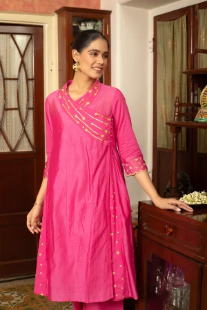 Angrakha Kurta with Pants, crafted from premium Chanderi fabric and featuring exquisite gota and dori detailing. This stunning ensemble is perfect for festive occasions and special celebrations, effortlessly combining tradition and style.