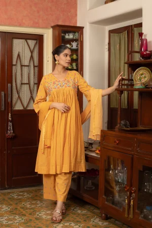 The gheredar silhouette of Empire Kurta offers a flattering fit, while the intricate embroidery on the yoke and pyjama adds a touch of sophistication and artistry. Crafted from soft, breathable cotton mulmul, this outfit ensures comfort. The included dupatta enhances the overall look, making it a versatile choice for any occasion.