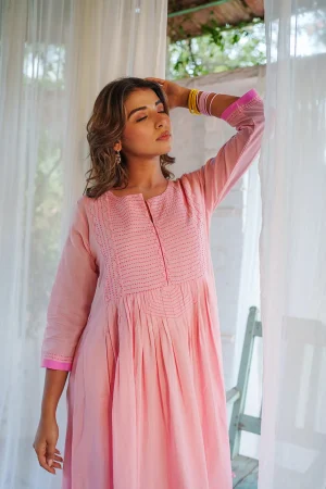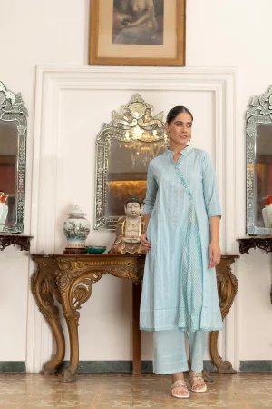 ₹5,500.00"Diagonal Fish Kali Kurta with Pants is a stunning ensemble crafted from wide pintuck cotton with delicate tissue detailing making it perfect for festive occasions or special gatherings."