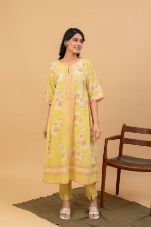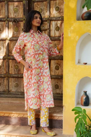 ₹4,400.00- Cotton Mulmul Handblock Printed Kurta with solid colour pants.