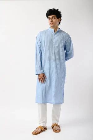 ₹2,950.00* Aqua fine pintuck kurta with chinese collar. * Full sleeves and 2 pockets on the sides. * Estimated ship time: 5 - 7 working days. * The garment color may vary slightly due to photographic lighting or the screen settings of your device. * Please check the measurement chart and return policy before placing the order. * Model is wearing size ’S’