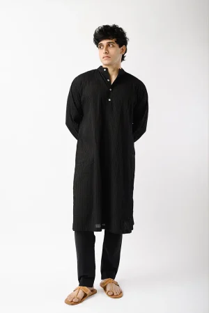 ₹2,950.00* Black fine pintuck kurta with chinese collar. * Full sleeves and 2 pockets on the sides. * Estimated ship time: 5 - 7 working days. * The garment color may vary slightly due to photographic lighting or the screen settings of your device. * Please check the measurement chart and return policy before placing the order. * Model is wearing size ’S’