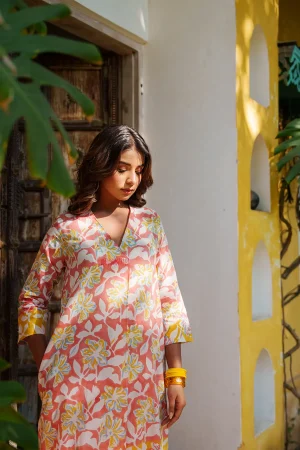 ₹4,300.00- Cotton Mulmul Handblock Printed Kurta with solid colour pants.