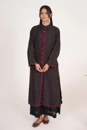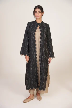 ₹9,500.00* Long Linen coat featuring contrast sultani stitching and kanni gudri, intricate scalloped embroidery along the front opening, hem, slits, and cuffs. * Style it with our rose kurta set. * Estimated ship time: 5 - 7 working days. * The garment color may vary slightly due to photographic lighting or the screen settings of your device. * Please check the measurement chart and return policy before placing the order. * Model is wearing size ’s’