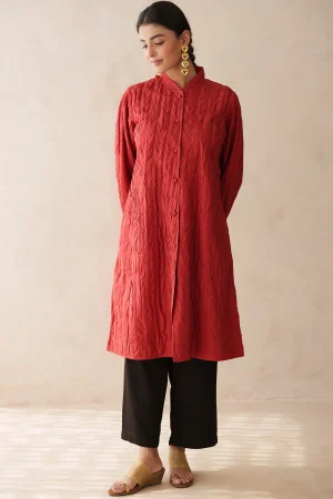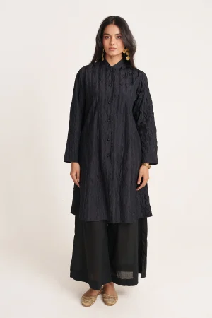 ₹10,500.00| * Front open Silk quilted full length coat. * Cotton lining. * Pockets. * Estimated ship time: 5 - 7 working days. * The garment color may vary slightly due to photographic lighting or the screen settings of your device. * Please check the measurement chart and return policy before placing the order. * Model is wearing size ’s’ |
