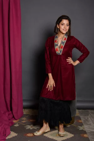Winter mini dress in our rich maroon silk velvet. Flattering embroidered overlap v-shaped neck. Wear it as a dress or pair it with pants. Actual color and print of product may vary as these are outcomes of handcrafted process.