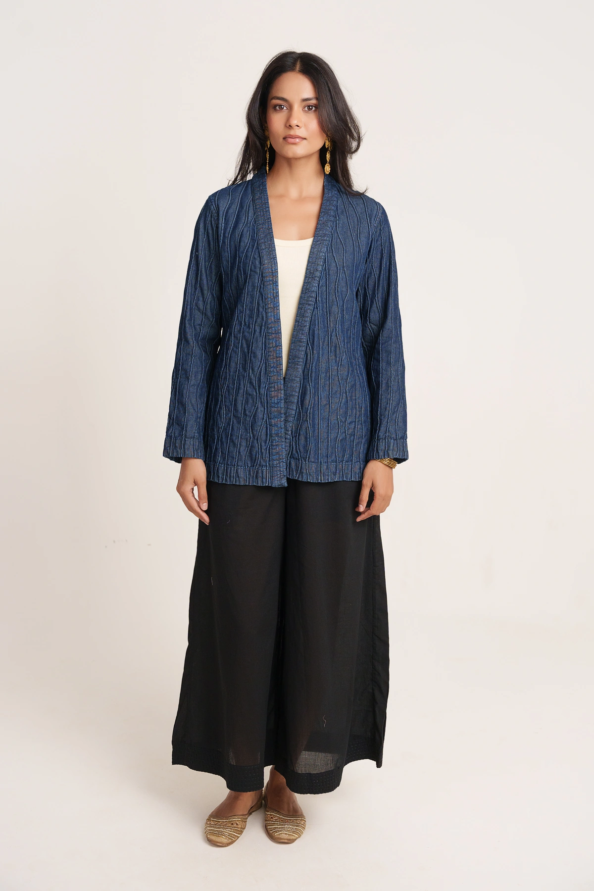 | * Silk A-line jacket with full sleeves. * Zigzag sultani detailing all over the jacket. * Matching potli buttons. * Pockets * Estimated ship time: 5 - 7 working days. * The garment color may vary slightly due to photographic lighting or the screen settings of your device. * Please check the measurement chart and return policy before placing the order. * Model is wearing size ’s’ |