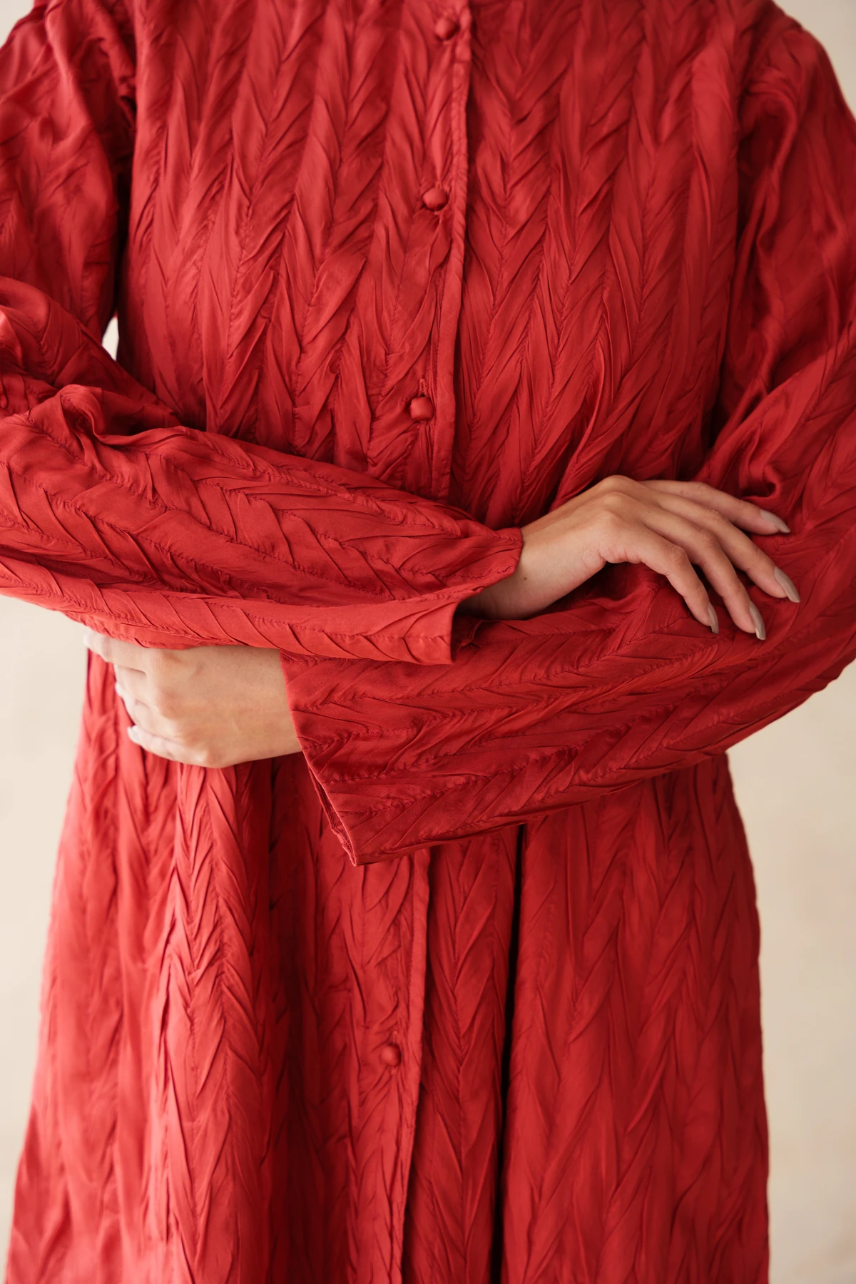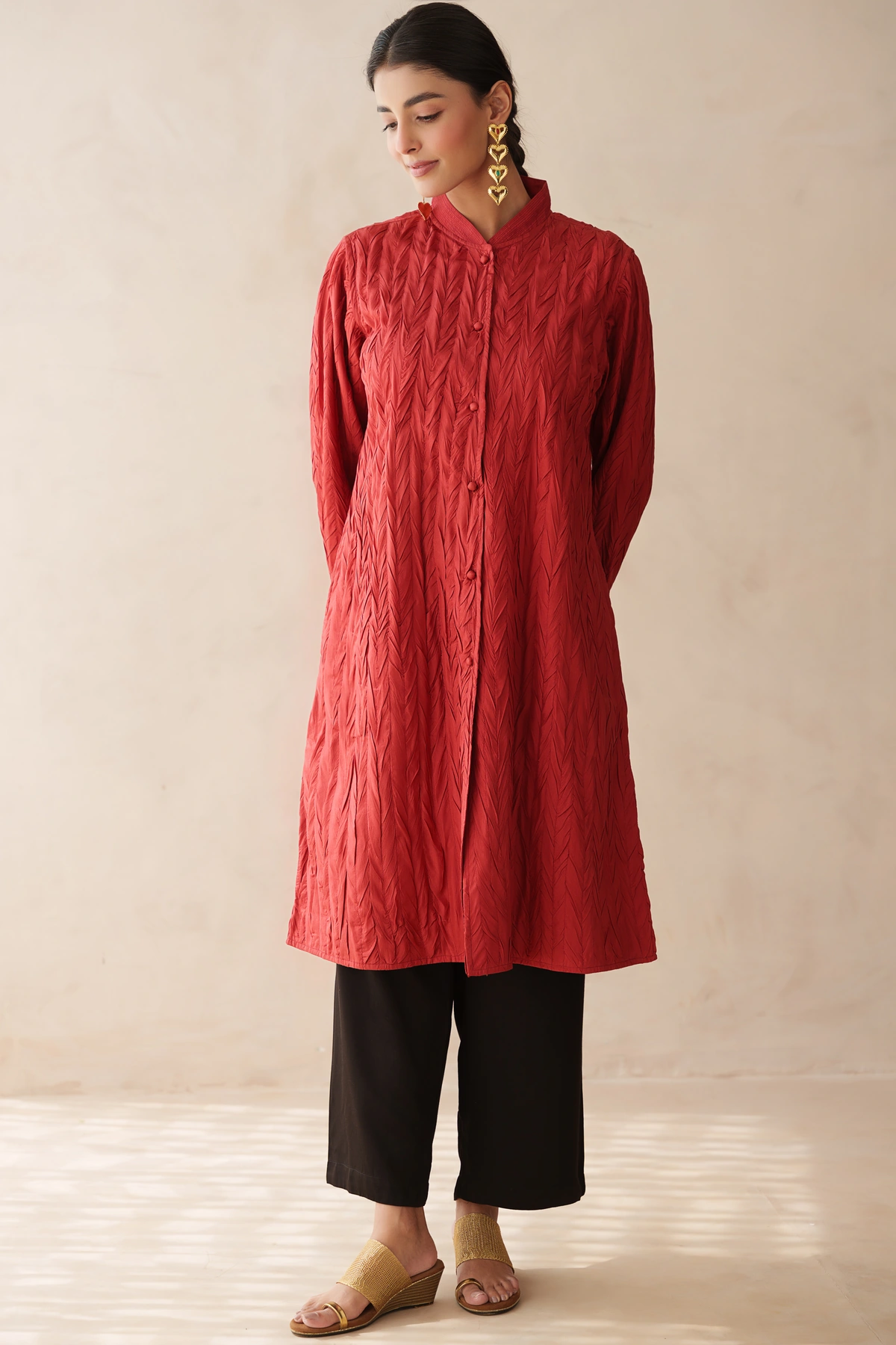 | This Maroon Silk A-line Jacket is a stylish layering piece crafted with a subtle zigzag sultani texture for a rich, tactile finish. The Chinese collar and front-open design with potli buttons give it a clean, modern edge, while the lightweight silk fabric ensures comfort and ease of movement. Knee-length and effortlessly versatile, it pairs beautifully with both Indian and contemporary outfits, adding instant polish to any look. |