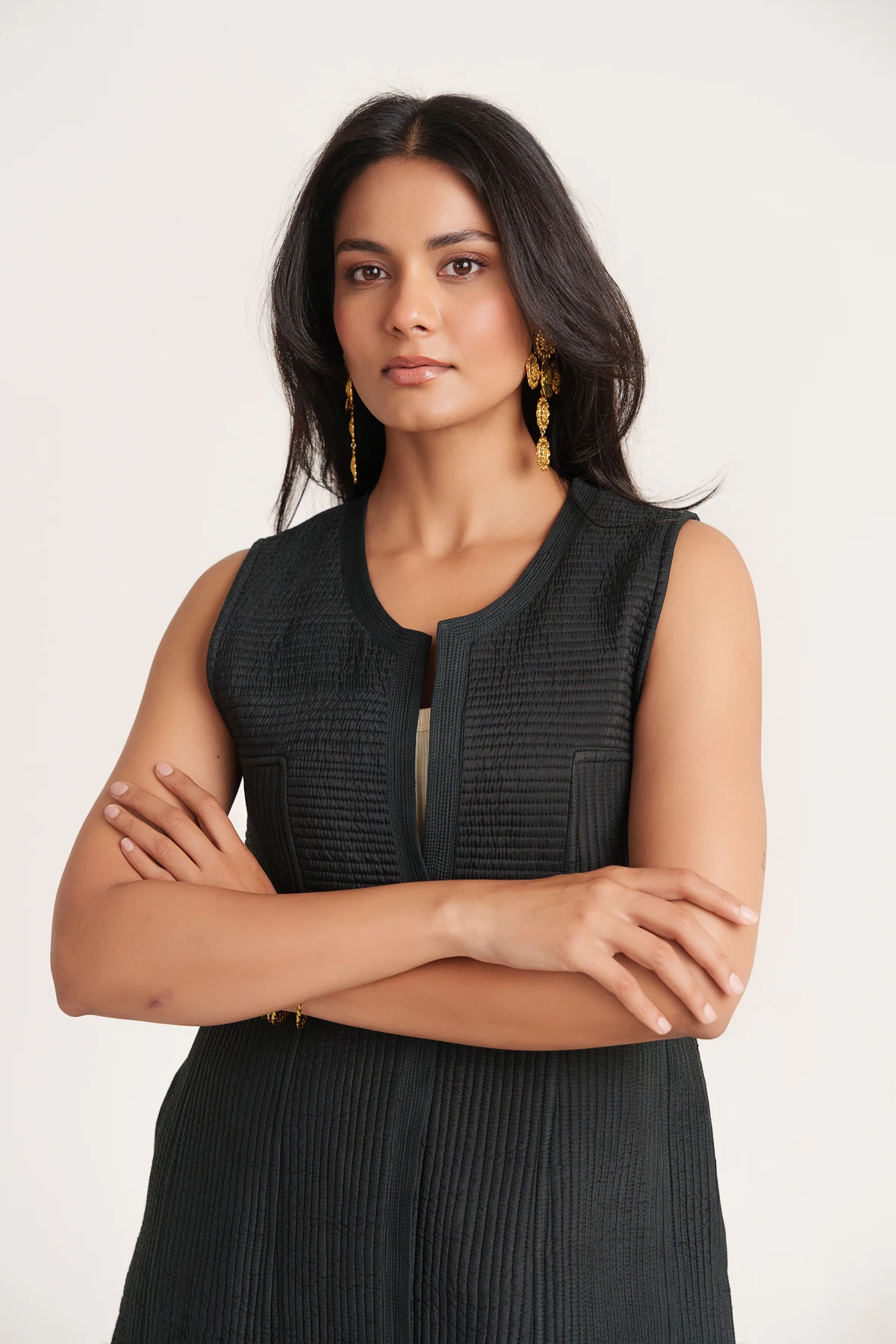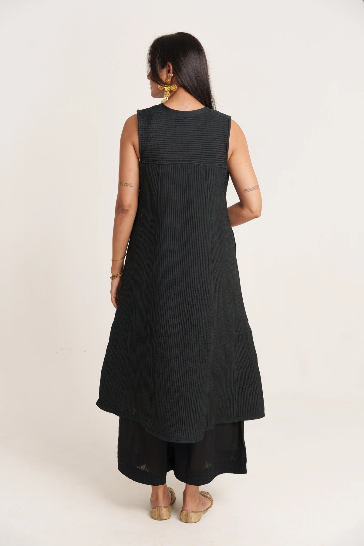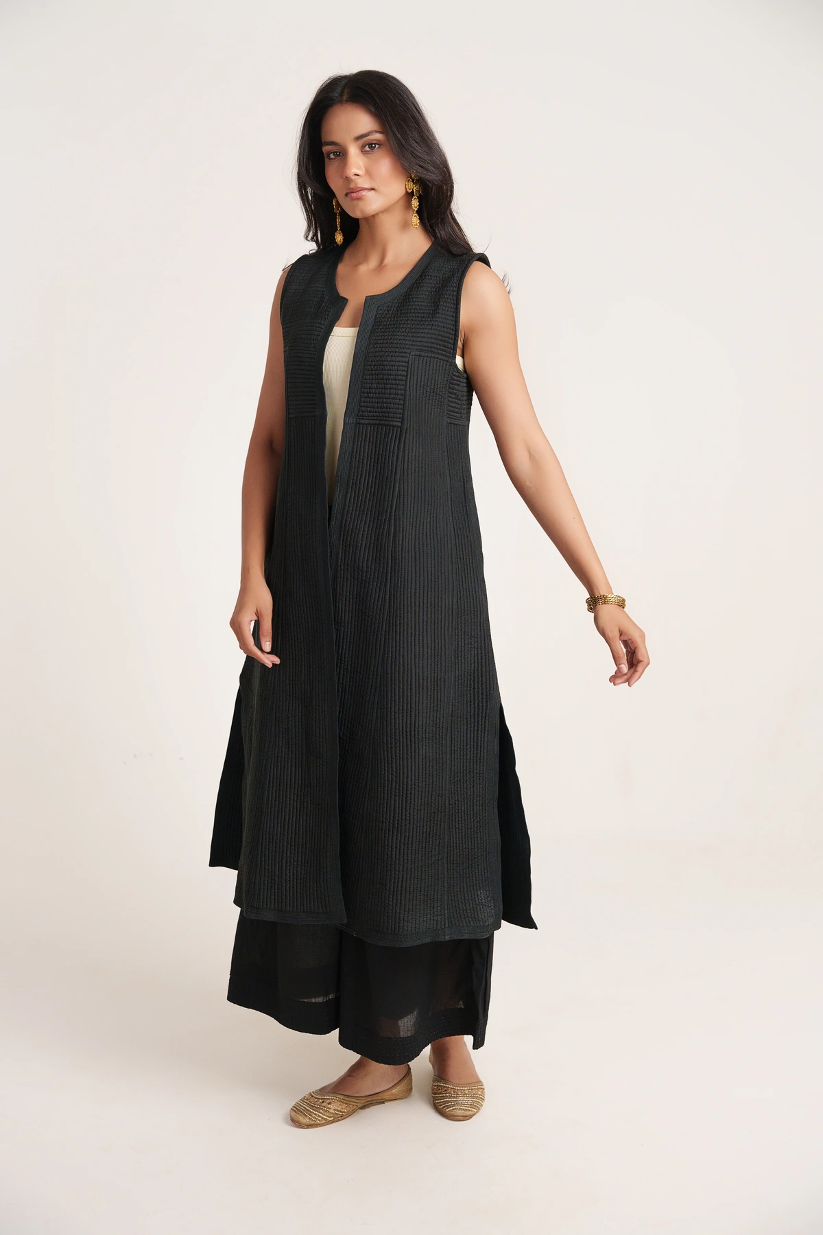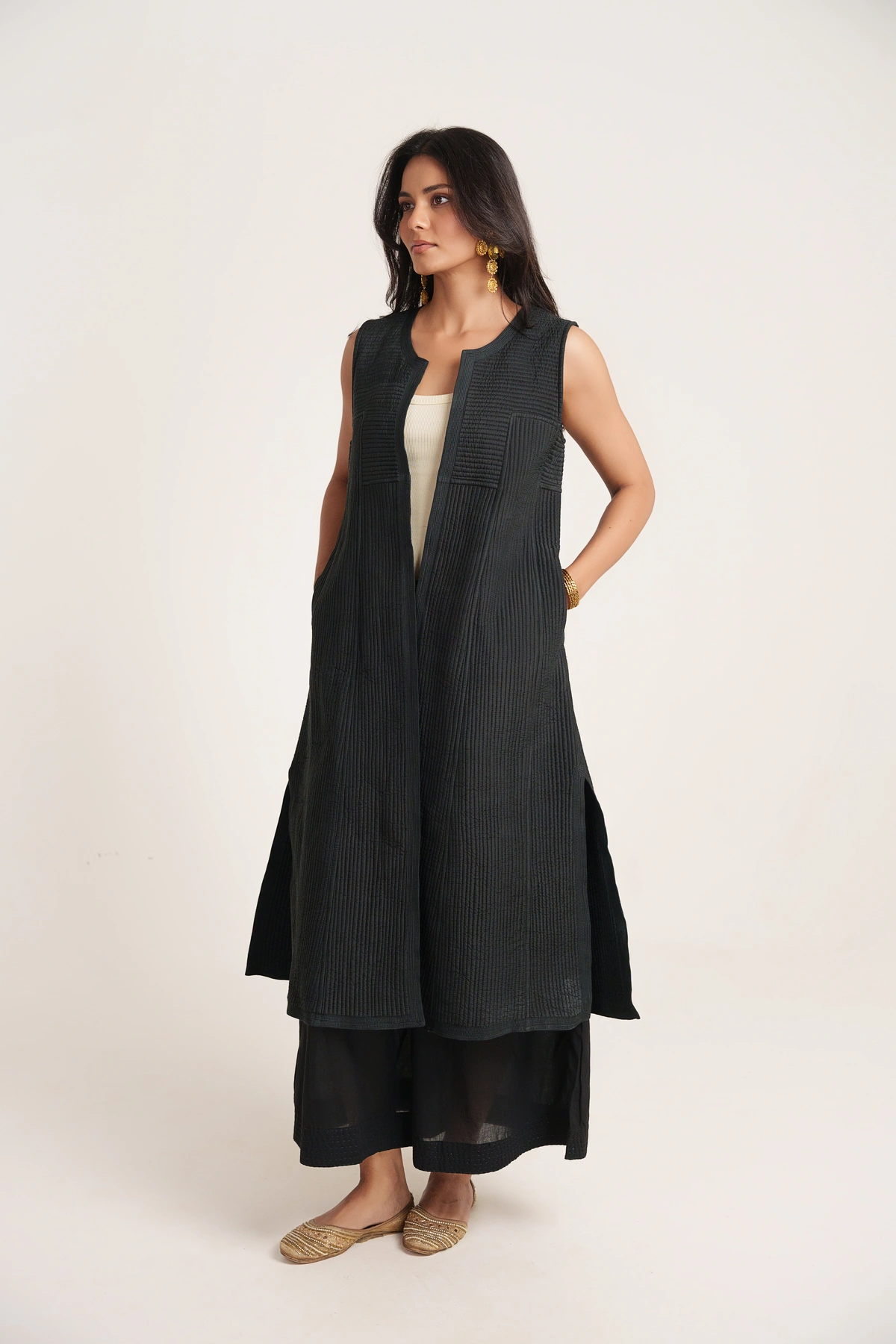 | Effortlessly stylish and versatile, this Black Sleeveless Silk Quilted Long Jacket adds a refined edge to any look. Designed with a front-open silhouette, soft cotton lining, and functional pockets, it combines comfort with modern design. The quilted silk texture brings depth and character, making it an ideal layer for both everyday looks and occasion wear. |