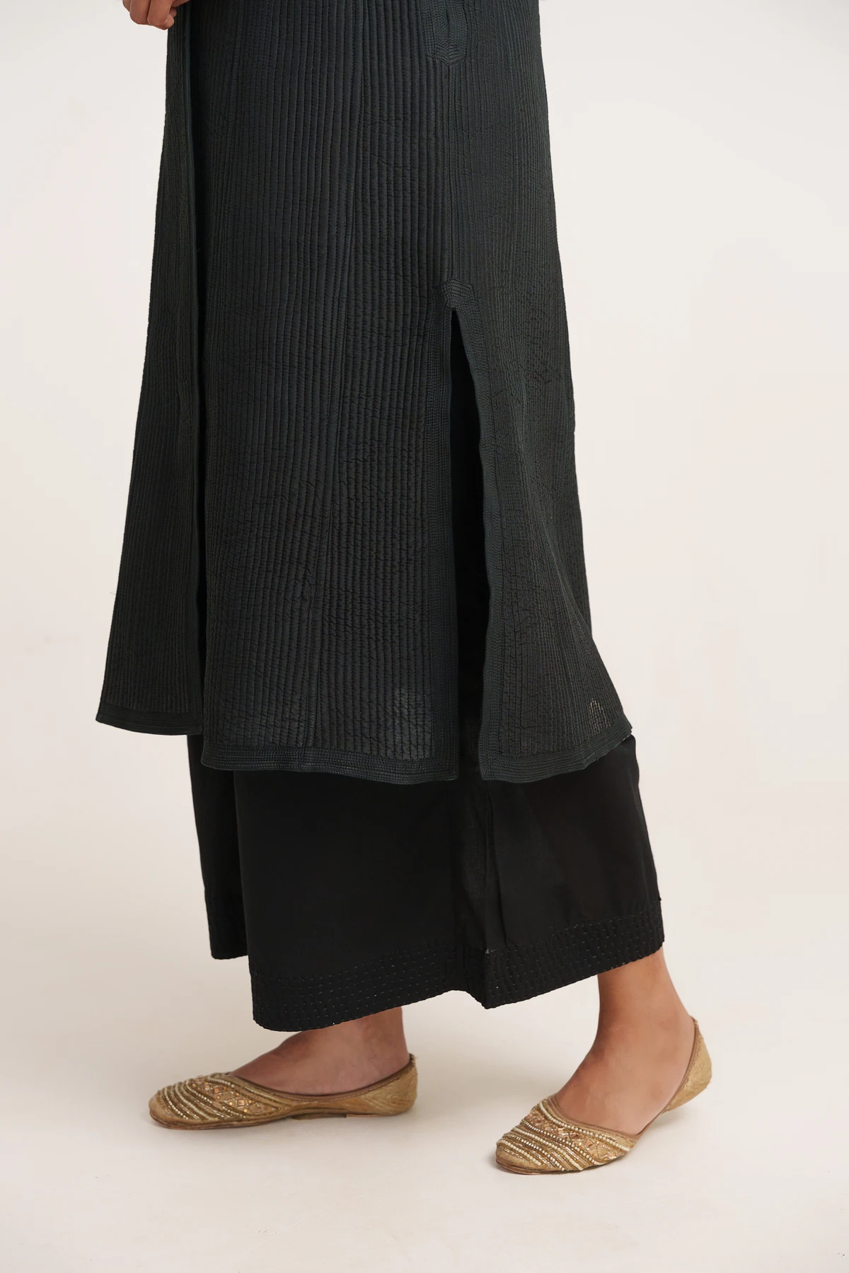 Our Bhopali Vest is a hand-quilted sleeveless mid-length jacket for women. Crafted from luxurious modal silk, this stunning vest features a soft cotton mulmul lining for ultimate comfort. Perfect for layering, its intricate quilting adds a touch of elegance and style to any outfit. Embrace versatility and sophistication with this unique piece, ideal for both casual and formal occasion.