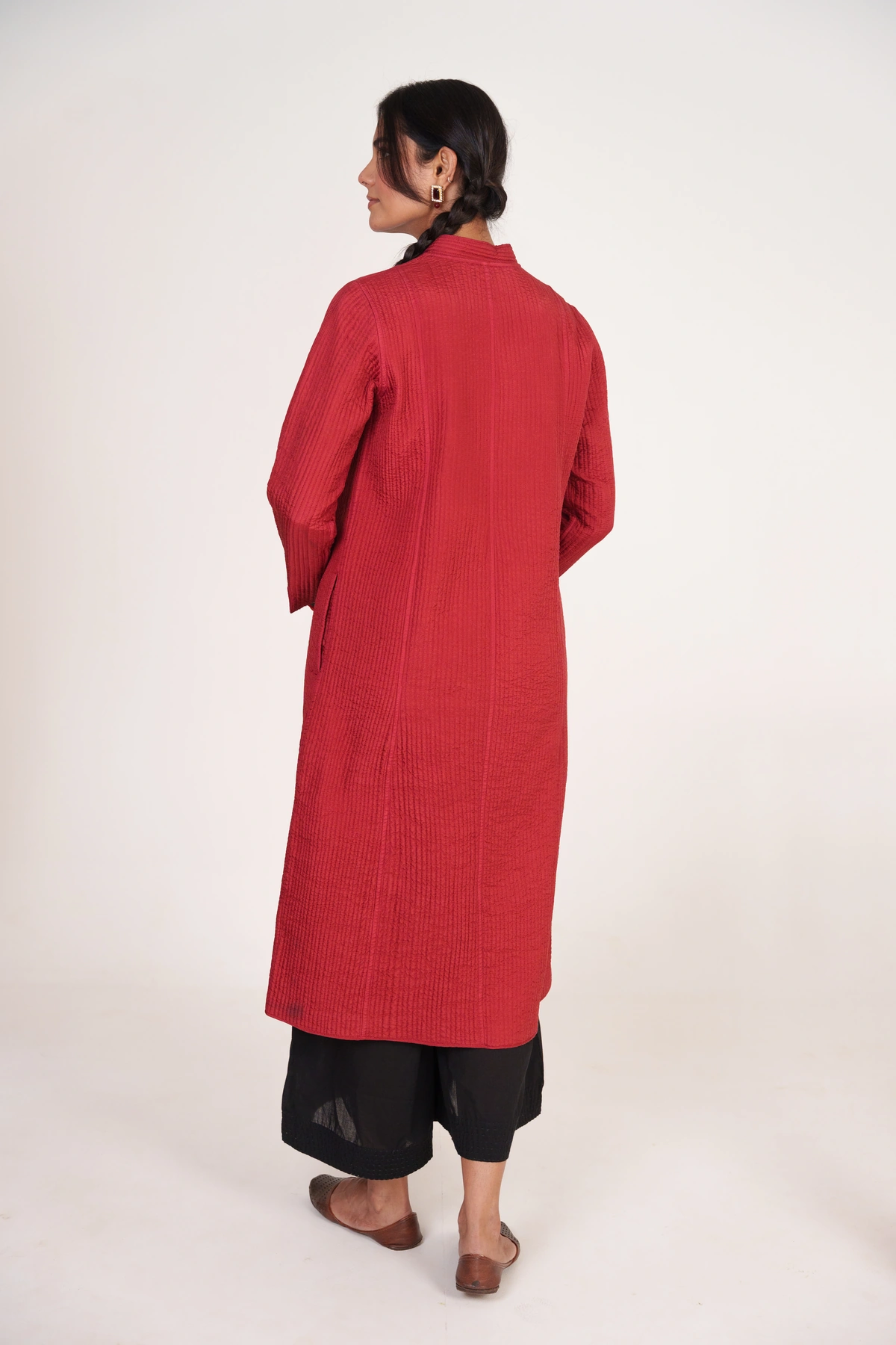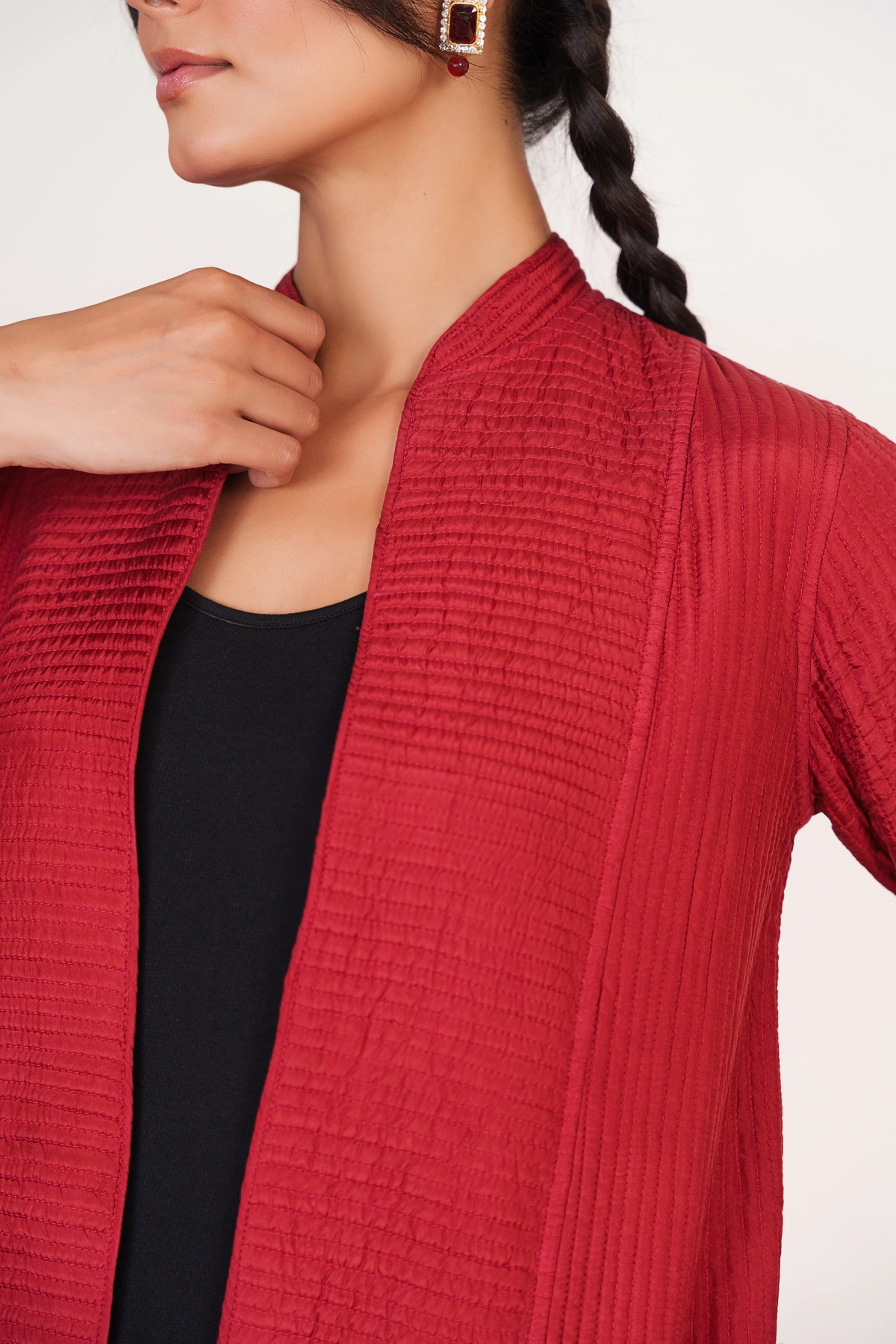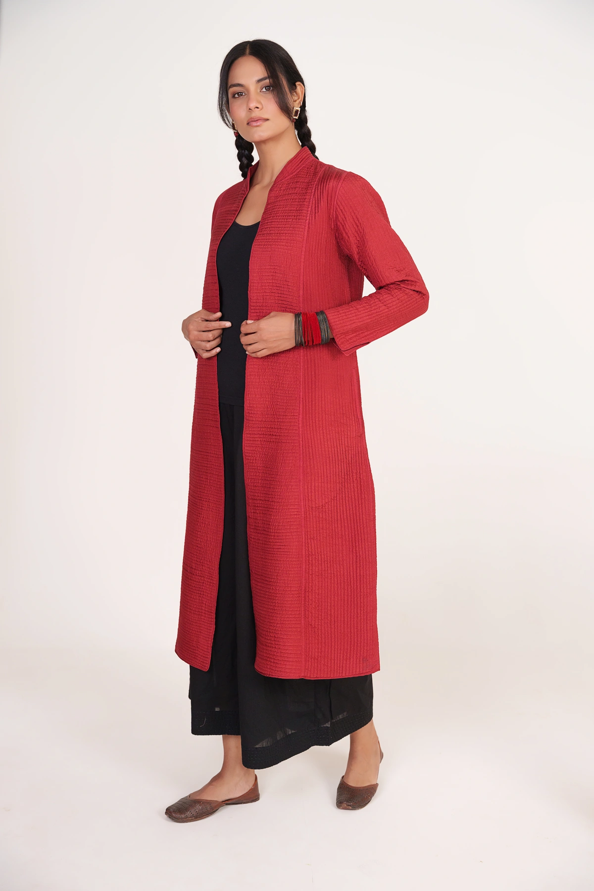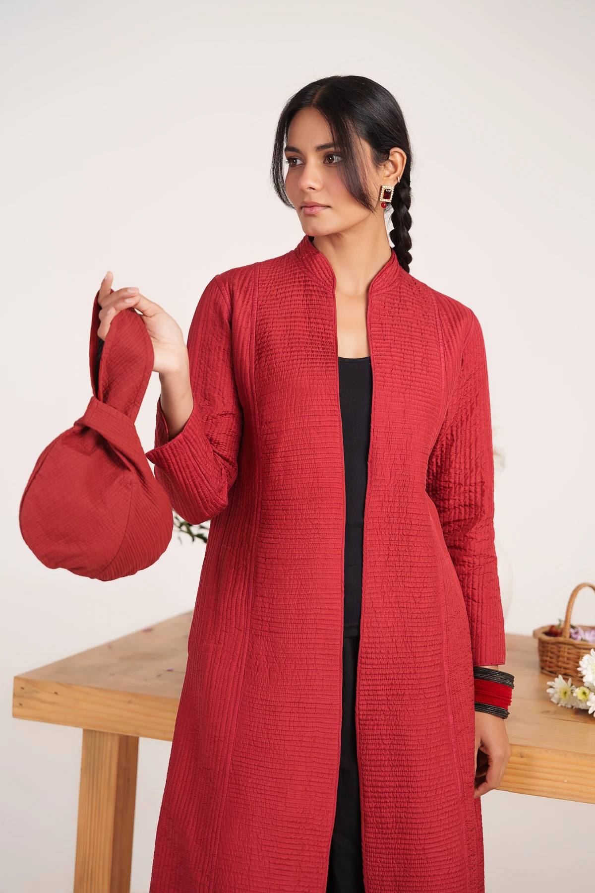 | Chic and statement-making, this Maroon Silk Quilted Full-Length Coat is designed to stand out. The front-open style and quilted silk texture create a sleek, structured look, while the cotton lining ensures comfort and breathability. Finished with practical pockets, this coat is the perfect mix of style and function — ideal for layering over both festive and contemporary outfits. |