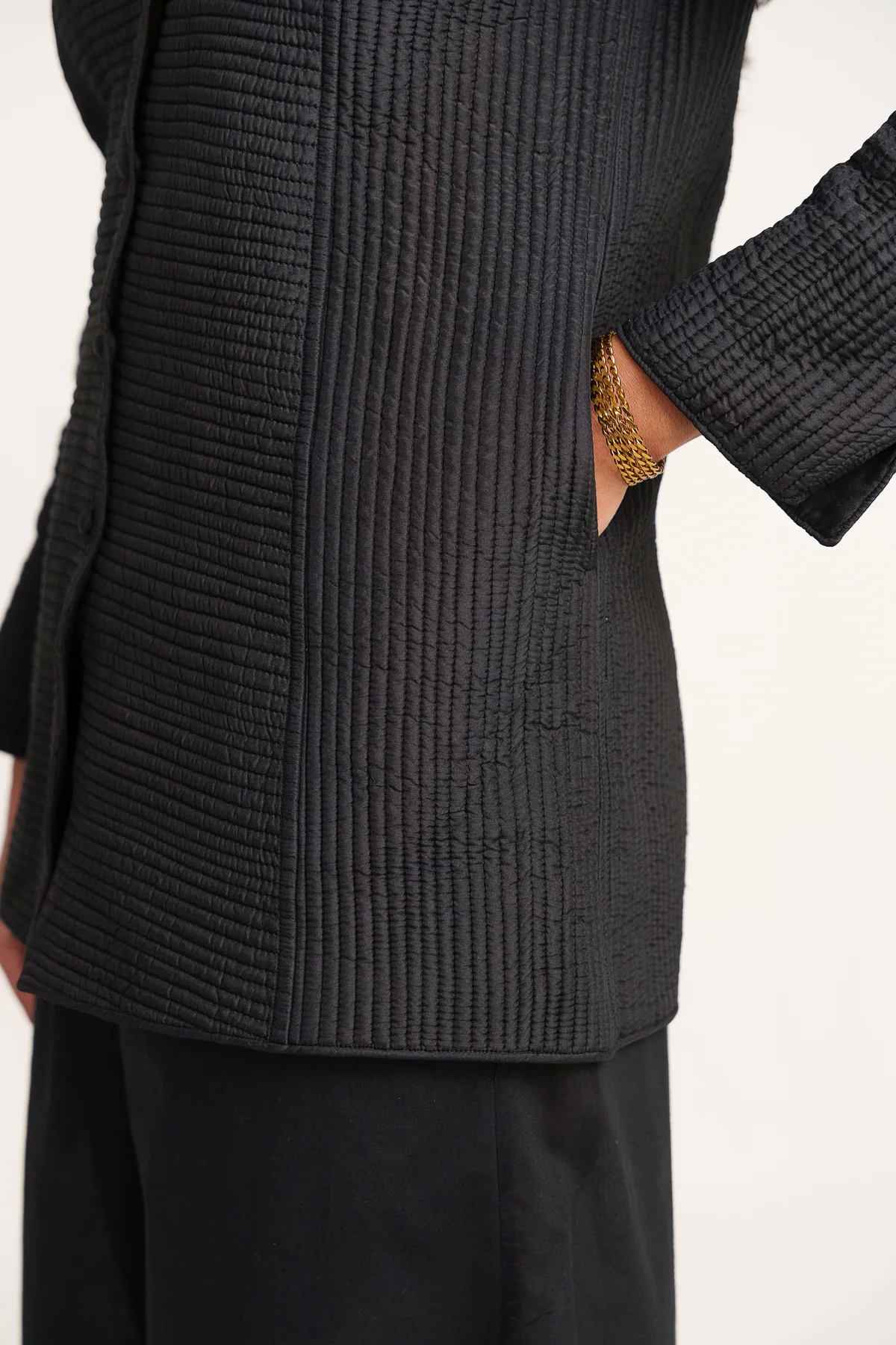| A modern classic, this Black Silk Quilted Jacket blends clean lines with effortless style. The Chinese collar and potli button closure give it a sharp, minimal edge, while the hip-length silhouette and full sleeves make it perfect for layering. Crafted in quilted silk with a soft cotton lining, it’s lightweight, comfortable, and endlessly versatile — ideal for adding texture and polish to any outfit. |