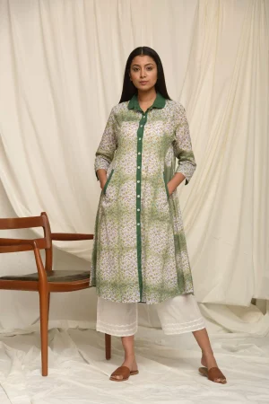 * Hand Blockprinted kurta with flap collar * Pockets in front. * Finished with French seam. * Estimated ship time: 5 - 7 working days. * The garment color may vary slightly due to photographic lighting or the screen settings of your device. * Please check the measurement chart and return policy before placing the order. * Model is wearing size ’S’