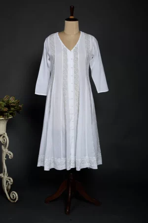 Cotton Mulmul 16 Panel Kalidar Kurta – White/Khakhi