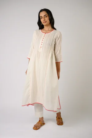 ₹4,400.00* Off-white kurta with pants. * Contrast red pintuck on front, back panel and sleeves. * Front button placket with potli buttons. * Finished with French seam. * Estimated ship time: 5 - 7 working days. * The garment color may vary slightly due to photographic lighting or the screen settings of your device. * Please check the measurement chart and return policy before placing the order. * Model is wearing size ’S’