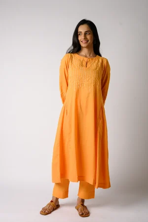 ₹3,800.00* Yellow Kurta set with round neck. * Kani Gudri Detailing on neck, yoke and sleeves. * Finished with French seam. * Estimated ship time: 5 - 7 working days. * The garment color may vary slightly due to photographic lighting or the screen settings of your device. * Please check the measurement chart and return policy before placing the order. * Model is wearing size ’S’