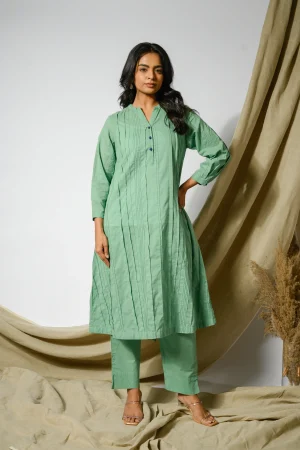 ₹4,400.00| * A-line Cotton green kurta. * Pintuck detailing all ove the kurta. * Finished with French seam. * Estimated ship time: 5 - 7 working days. * The garment color may vary slightly due to photographic lighting or the screen settings of your device. * Please check the measurement chart and return policy before placing the order. * Model is wearing size ’xs’ |