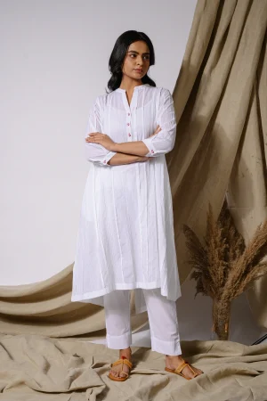 ₹4,400.00| * A-line Cotton white kurta. * Pintuck detailing all ove the kurta. * Finished with French seam. * Estimated ship time: 5 - 7 working days. * The garment color may vary slightly due to photographic lighting or the screen settings of your device. * Please check the measurement chart and return policy before placing the order. * Model is wearing size ’xs’ |