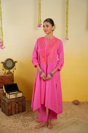 * Cotton Mulmul Fuchsia asymmetrical kurta with silk yoke highlighted with Jali stitch and gudri work.