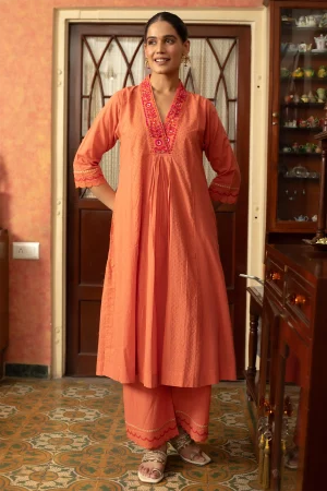 ₹4,900.00Gusset Kurta with Pants in textured cotton mulmul features embroidery on the kurta and along the hem of the pants, adding a touch of sophistication and charm. The gusset design enhances the silhouette, providing a flattering fit that allows for ease of movement.