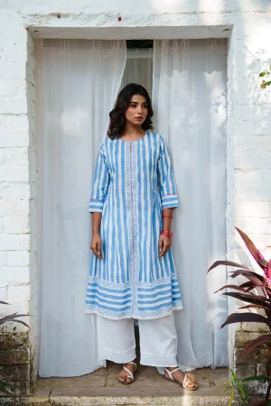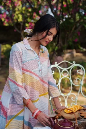 ₹4,600.00| * Cotton mulmul handblockprinted co-ord set. * Collared kurta in stripes with a coordinated ikat pants. * Finished with French seam. * Estimated ship time: 5 - 7 working days. * The garment color may vary slightly due to photographic lighting or the screen settings of your device. * Please check the measurement chart and return policy before placing the order. * Model is wearing size ’xs’ |