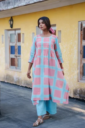₹4,900.00| * Collared handblock printed kurta with pants. * Pintucked yoke highlighted with gudri stitch. * Gudri stitch at back yoke and cuffs. * Front open kurta secured with potli buttons. * Contrast print pants. * Finished with French seam. * Estimated ship time: 5 - 7 working days. * The garment color may vary slightly due to photographic lighting or the screen settings of your device. * Please check the measurement chart and return policy before placing the order. * Model is wearing size ’xs’ |