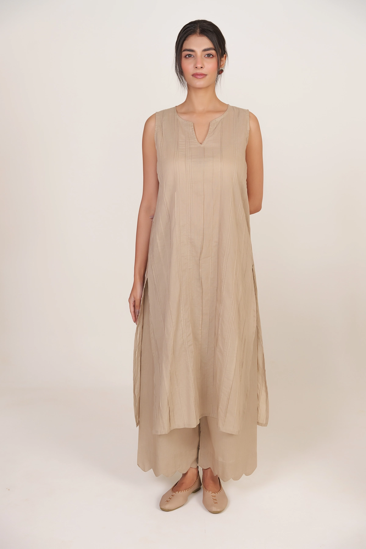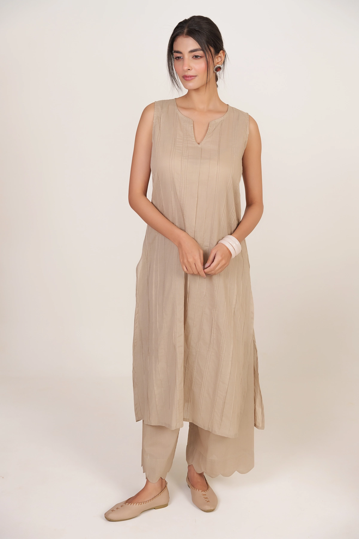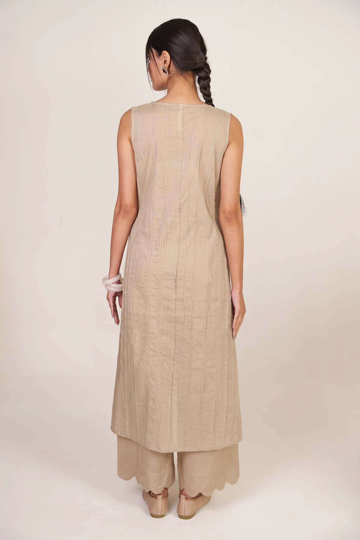The Rose Kurta Set in beige linen is a perfect blend of texture and ease. The sleeveless kurta features delicate pintuck detailing all over, giving it a soft, structured look, while the pyjama is finished with a scalloped hem for a refined touch. Light, breathable, and versatile, this set pairs beautifully with our Rose Coat for a coordinated, modern ensemble.