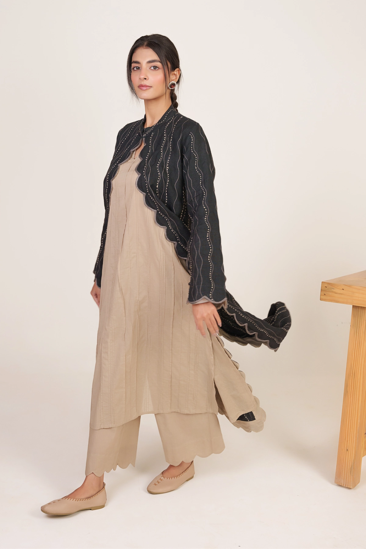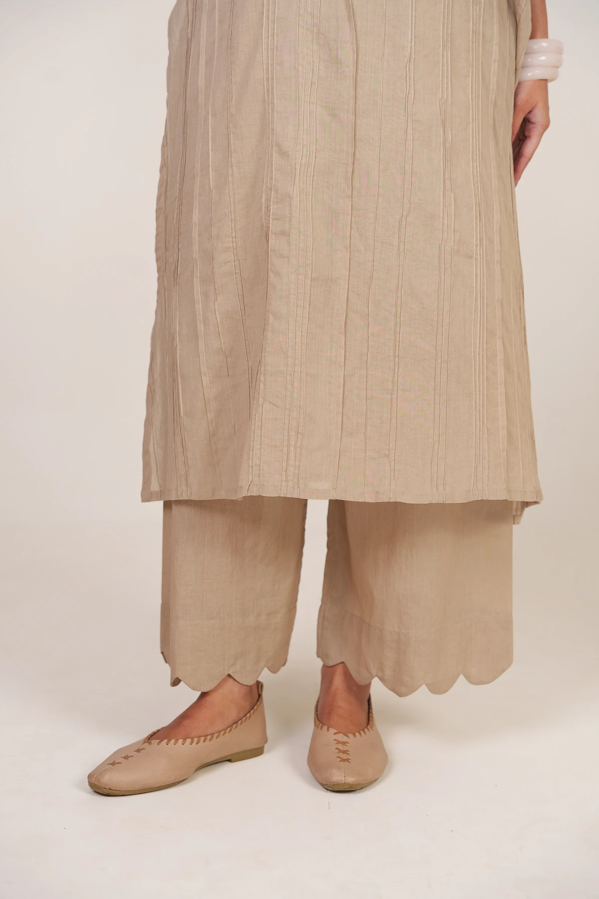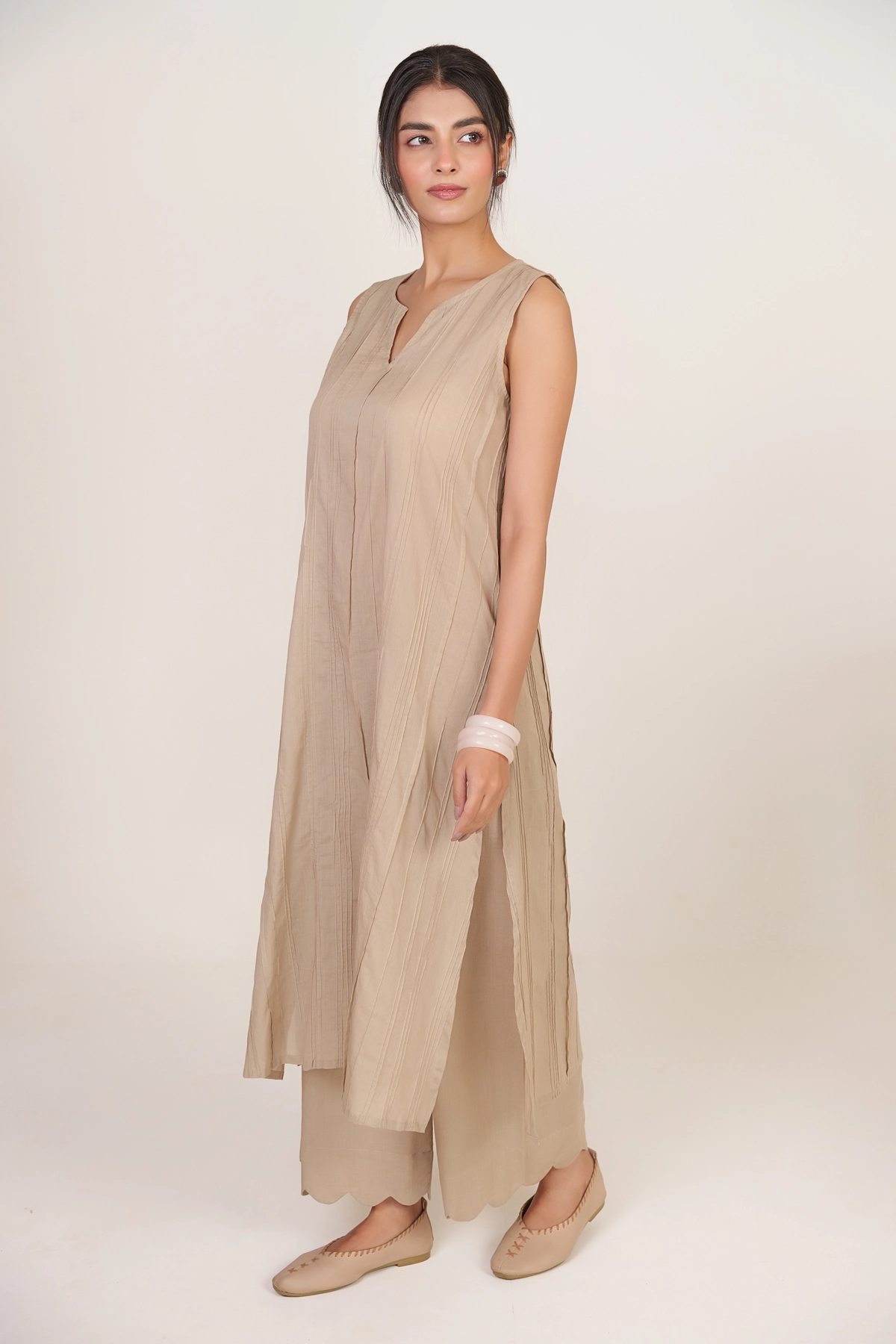 The Rose Kurta Set in beige linen is a perfect blend of texture and ease. The sleeveless kurta features delicate pintuck detailing all over, giving it a soft, structured look, while the pyjama is finished with a scalloped hem for a refined touch. Light, breathable, and versatile, this set pairs beautifully with our Rose Coat for a coordinated, modern ensemble.