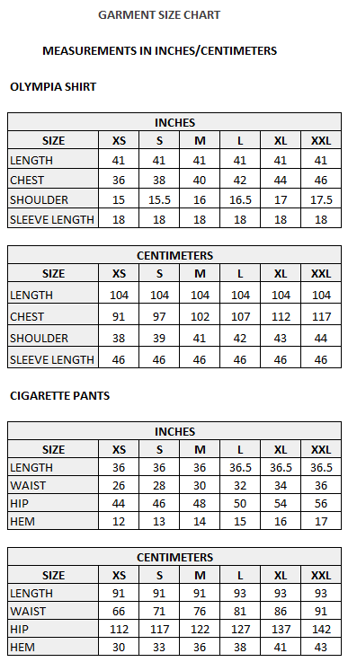 GARMENT SIZE CHART.