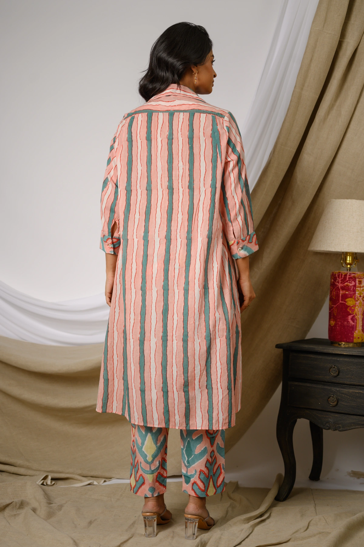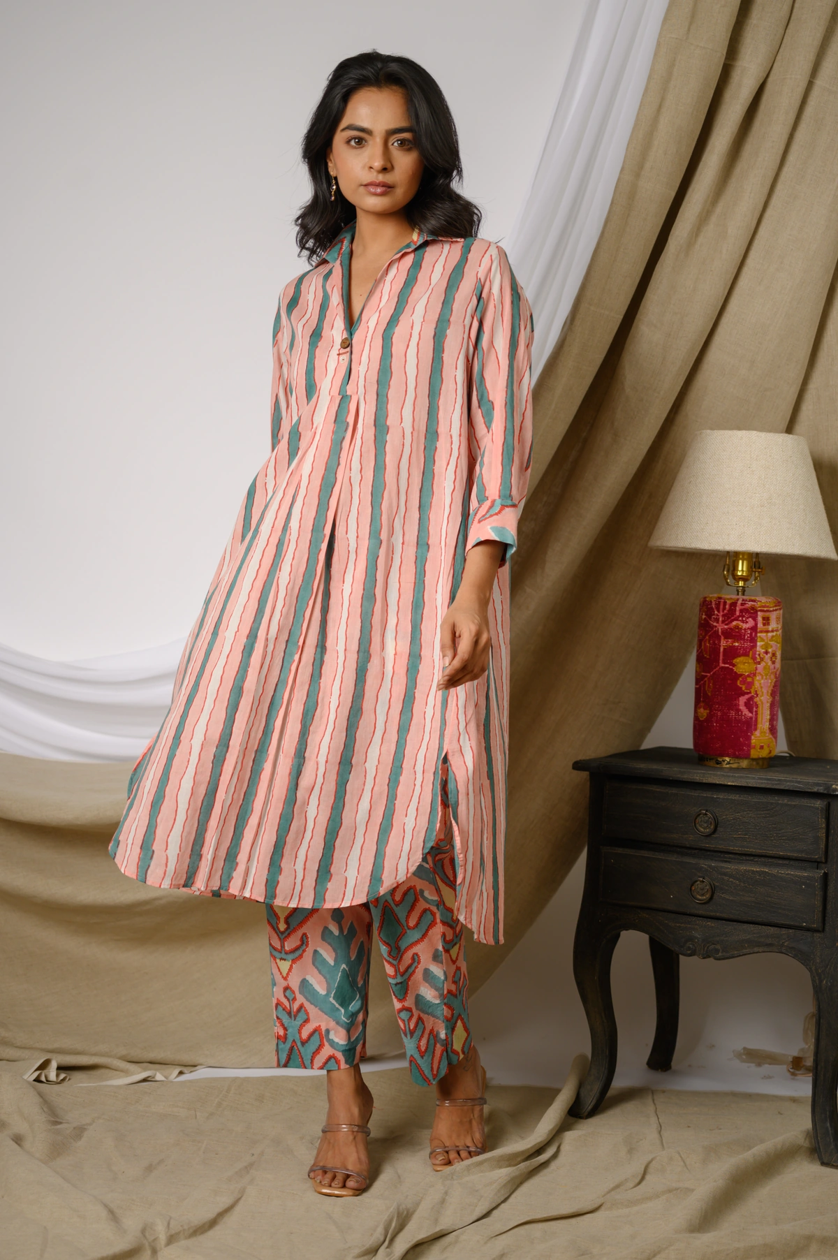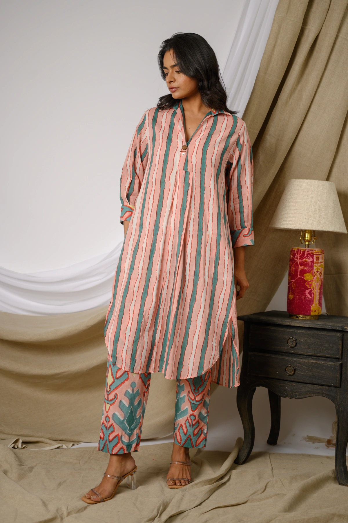 Step into effortless elegance with the Olympia Co-ord Set, a beautifully coordinated ensemble crafted in breathable cotton. This stylish set features a collared kurta adorned with a classic stripes print, enhanced by a subtle two-button detail at the neckline for a touch of sophistication. Paired with ikat-printed pants, the contrasting yet complementary handblock prints create a striking visual harmony.